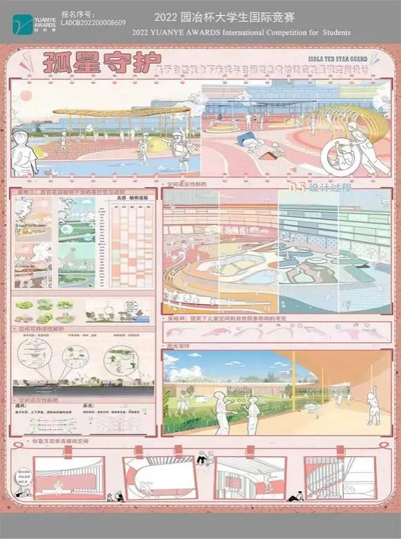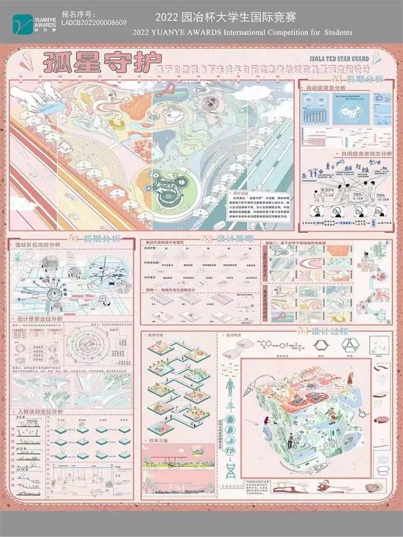 近日,2022年第十三届园冶杯老员工国际竞赛公共设计类作品获奖名单揭晓,由公司教师姚莎、刘璐指导的2018级环境艺术专业员工孙秋菊的作品《基于自然教育视角下未成年自闭症患者的适用性景观空间设计》、何佳炜的作品《山东东营土地盐碱化景观生态修复设计策略》、2019级环境设计专业员工王源杰、潘玥文、张晶、李杰杰、王小文五位同学的作品《基于CPTED理论下校园空间景观设计》分别斩获此次2022年第十三届“园治杯”国际竞赛3个荣誉奖,此次获奖是公司环境设计专业团队建设“赛教融合”的重要突破。近年来,公司在高水平赛事中屡获佳绩,是公司以赛促教、以赛促学、以赛促研的成果体现,为公司员工的专业能力培养起到良好的促进作用。