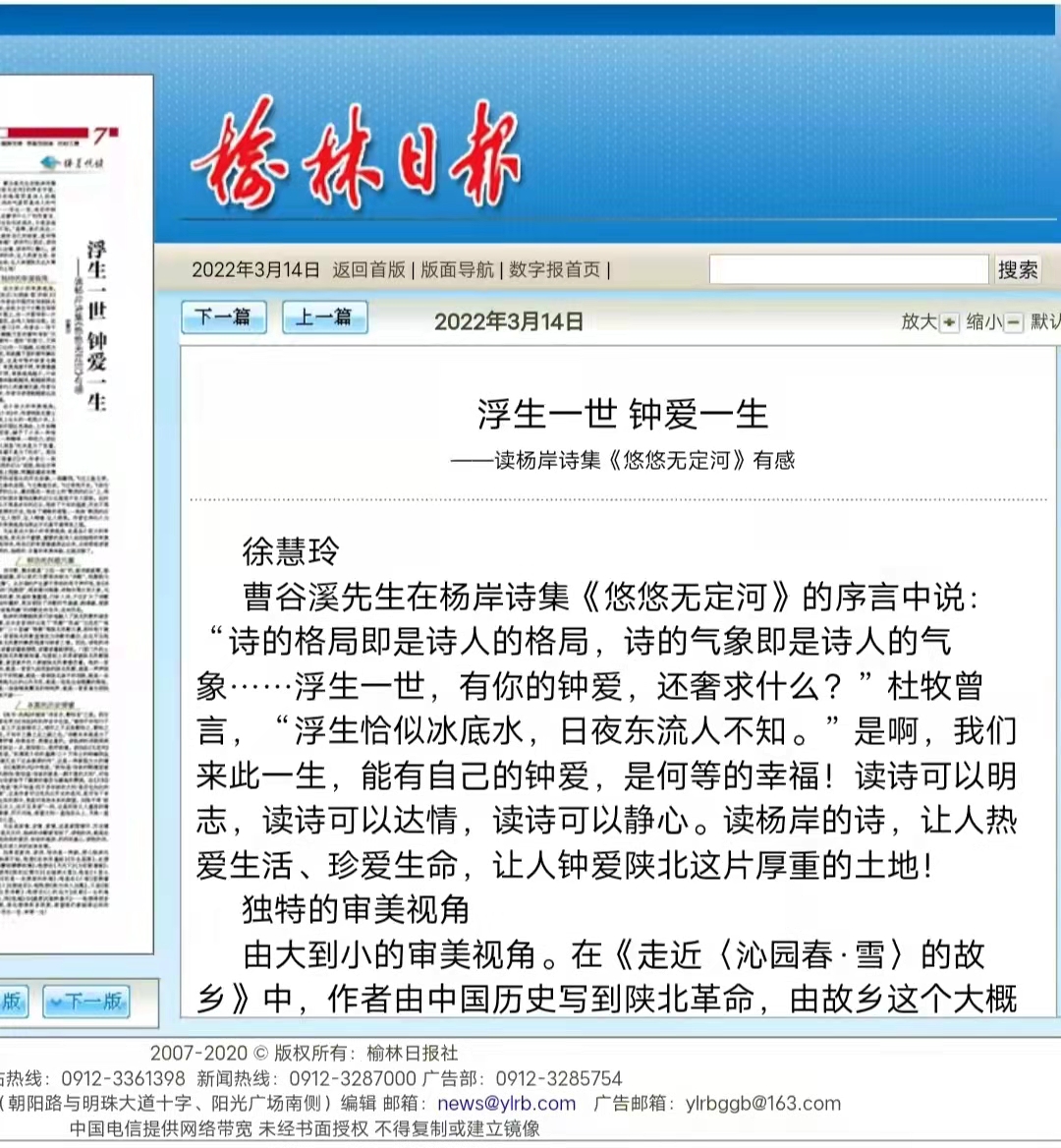 3月14日出版的《榆林日报》刊登了公司行政秘书徐慧玲的署名文章 浮生一世 钟爱一生——读杨岸先生诗集《悠悠无定河》之感