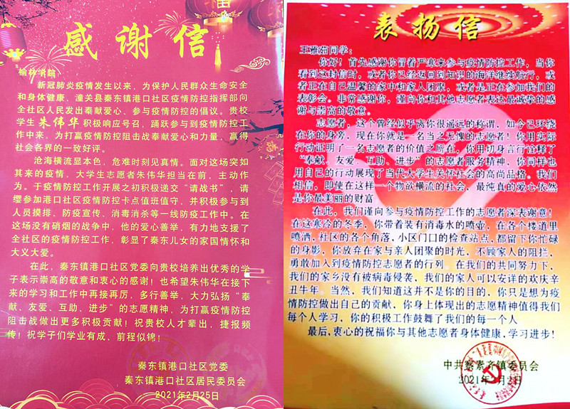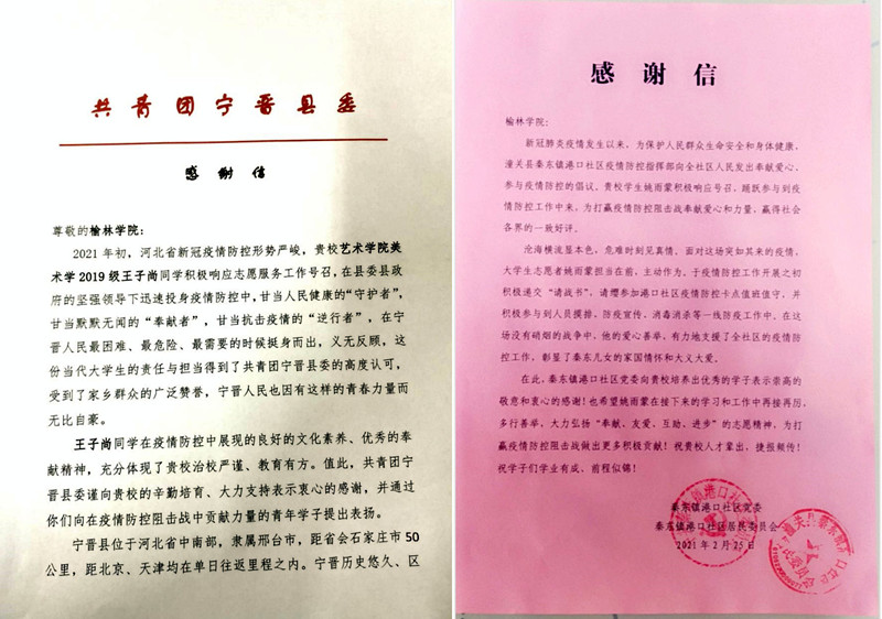 近日,公司收到四封来自中国共产主义青年团宁晋县委员会、中共察素齐镇委员会、 秦东镇港口社区党委的感谢信。信中对公司19级美术学专业王子尚、20级美术学专业王雅茹、 19级视觉传达专业朱伟华、20级舞蹈学专业姚雨蒙同学在疫情期间积极参与疫情防控志愿工作给予了高度评价,表达了诚挚的感谢。