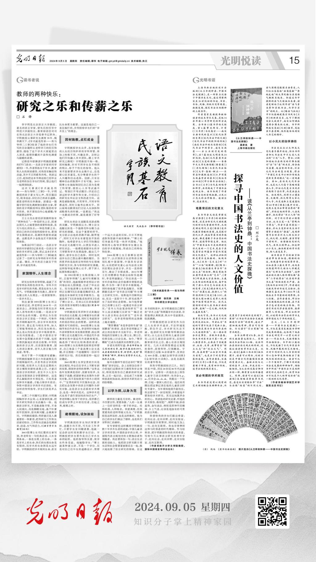 《光明日报》2024年9月5日第15版刊发了公司党总支书记刘小龙的署名文章:《探寻中国书法史的人文价值——读莫家良〈从兰亭到钟鼎:中国书法史探微〉》。该文主要从笔墨背后的文化意义、言必有据的学术规范、以小见大的治学路径等方面评述了上海书画出版社今年5月份重磅推出的莫家良先生的书法学学术文集。