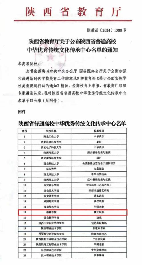 近日,陕西省教育厅公布了全省普通高校中华优秀传统文化传承中心名单,全省23所高校入选,榆林公司《陕北民歌》项目名列其中。这是公司继《陕北秧歌》之后又一次获批陕西省普通高校中华优秀传统文化传承项目;此前,《陕北秧歌》已于2020年被列入教育部国家级优秀传统文化传承项目。