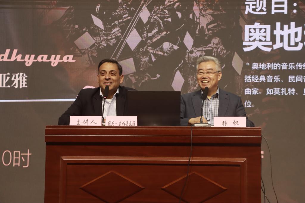 Vijay教授系统梳理了奥地利古典音乐的发展脉络,从海顿、莫扎特到马勒,解析了奥地利音乐在旋律结构、和声运用及情感表达上的独特性。结合他的实践创作,分享了当代奥地利音乐在全球化背景下的创新探索,并对比中国传统文化与经典音乐创作提出“音乐无国界,文化可共鸣”的艺术理念。他鼓励师生以开放心态汲取多元文化养分,在传承中国传统音乐的同时,探索其与西方音乐融合的可能性。