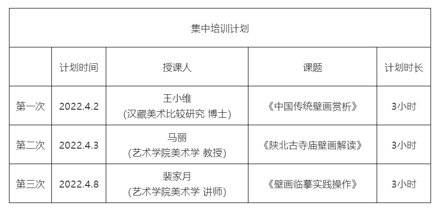 活动以学习、竞赛相结合的方式开展。由于壁画临摹具有一定的专业性,为了活动能达到良好的效果,安排榆林市壁画科技与文化融合重点实验室科研团队成员对参赛人员进行专业知识的讲授以及全程的绘画临摹辅导。学习安排持续一个月(2022.4.1--2022.4.30),包括三次讲座形式的集中培训与演示。