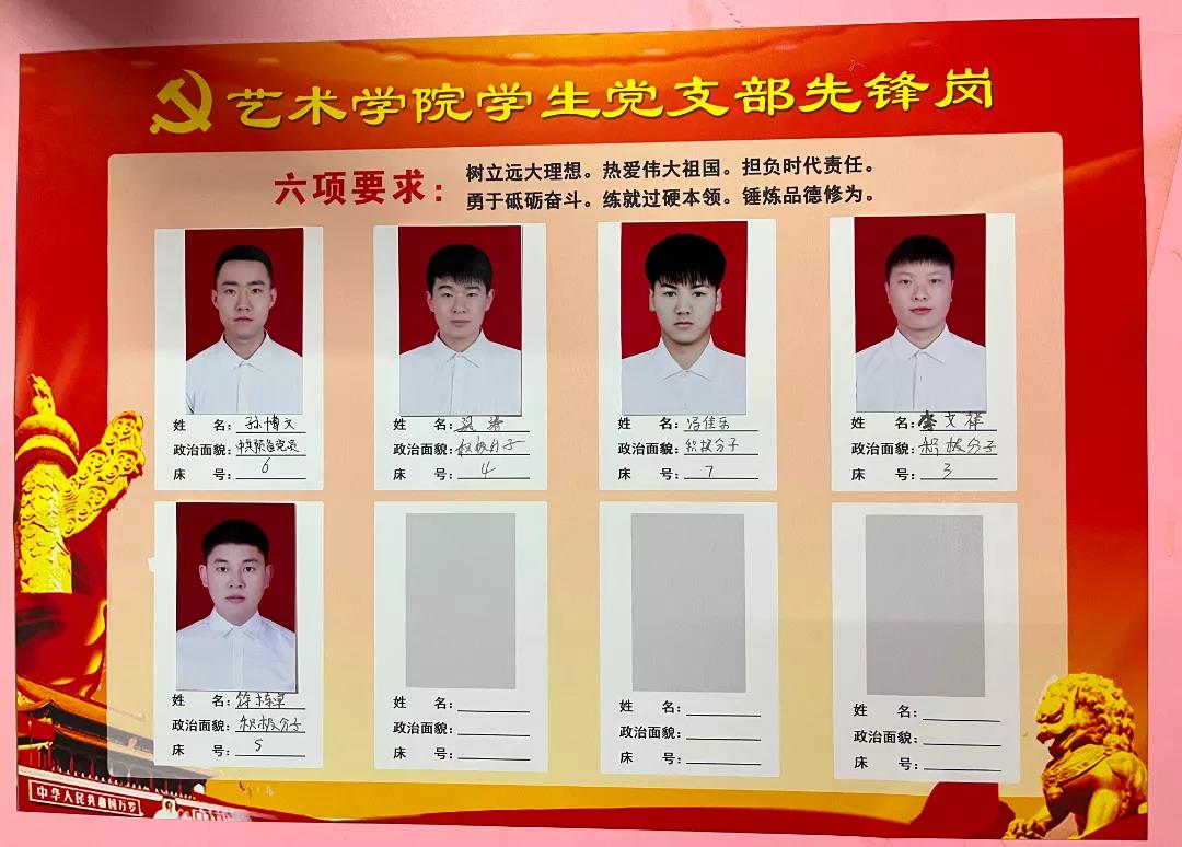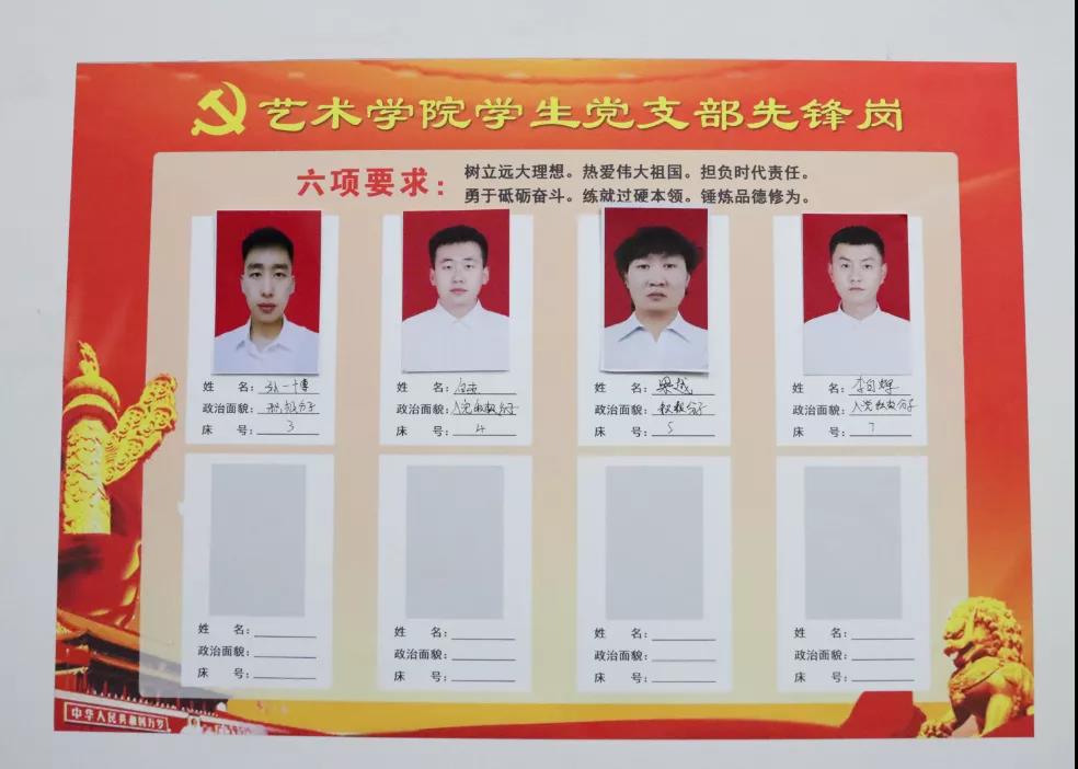 12月8日早上10:00,公司员工党支部分别对5号、7号、9号宿舍楼对有积极分子、预备党员、党员的宿舍设立先锋岗,将个人照片和信息张贴在先锋岗表中,旨在立好标杆、树好典型,发挥好入党积极分子、预备党员、党员的先锋模范作用。
