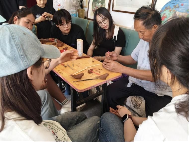 王维生老师先在室内展示泥塑资料与代表作品,讲述自己的创作历程:从儿时与泥土为伴的热爱,到拜师学艺的坚守,再到形成独特风格的创新,他的故事让队员们对非遗传承之路有了更真切的感悟。随后,王老师带着大家到室外介绍传统泥塑工具,从取土、和泥到塑形的工具用途,一一细致讲解。回到室内,王老师手把手传授泥塑技艺:先用高粱杆搭建“骨架”,再用陶泥填补“肉身”,最后精细塑形、上色。队员们从生疏到熟练,在指尖的揉捏中,一件件充满创意的炕头狮泥塑逐渐成型,亲身感受到非遗文化的魅力。