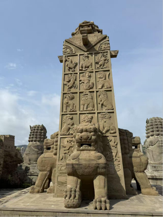 抵达绥德后,团队稍作休整便直奔石狮子广场。刚下车,34根高耸的石狮柱便映入眼帘,它们整齐排列在道路两侧,石狮神态各异、气势不凡,狮崖的苍劲、龙柱的灵动、石城楼的古朴与“石魂”照壁的厚重相映成趣,队员们无不被这浓郁的陕北石文化震撼,纷纷驻足记录这独特的民俗景观。